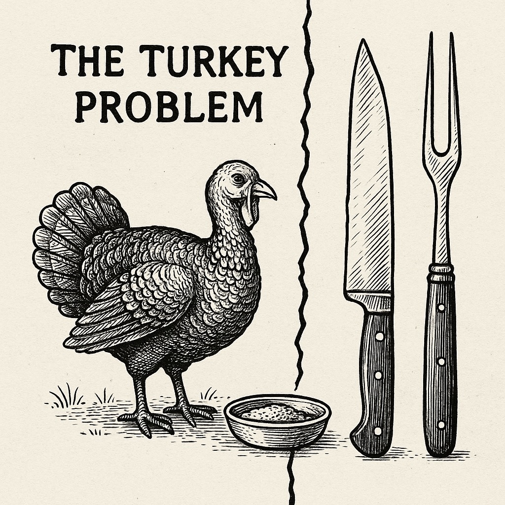 A turkey is fed for 1 000 days and concludes that humans love turkeys — until day 1 001, when it suddenly learns about Thanksgiving.