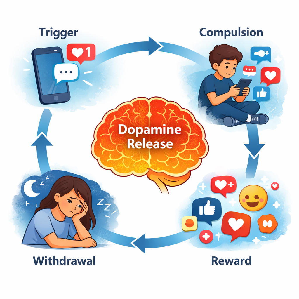 Smartphones and social media train the brain toward constant social evaluation, intermittent reward, and heightened threat sensitivity. Dopamine systems become tuned to external validation. Fear circuits are activated again and again. All of this happens before the brain’s regulatory systems are fully developed. The result is not resilience, but fragility: a nervous system optimized for avoidance, comparison, and reassurance.
