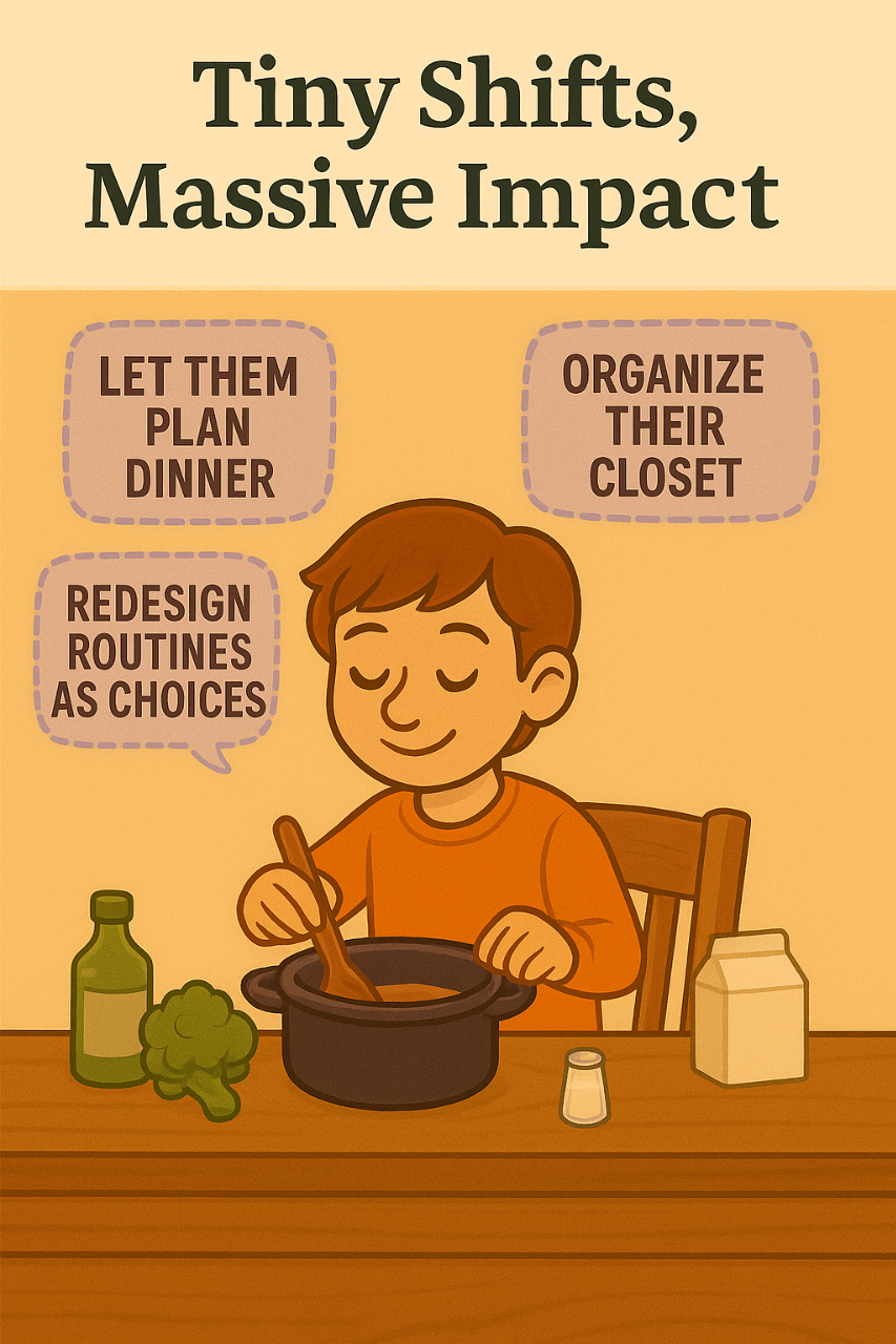 - Redesign routines as choices. Bedtime is non-negotiable. But how they get there can be up to them, shower before or after reading, for example. The boundary holds; the agency lives inside it.